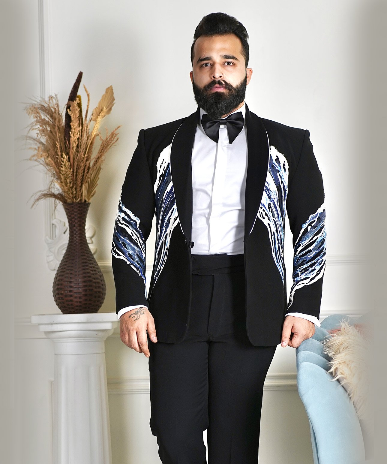 Immerse yourself in contemporary artistry and timeless elegance with the Black Hand-Painted Marble Waves & Embroidered Tuxedo Set from The Nawabs Clothing. Designed for the modern gentleman who appreciates creativity and craftsmanship, this tuxedo captures the perfect balance between art and luxury fashion.