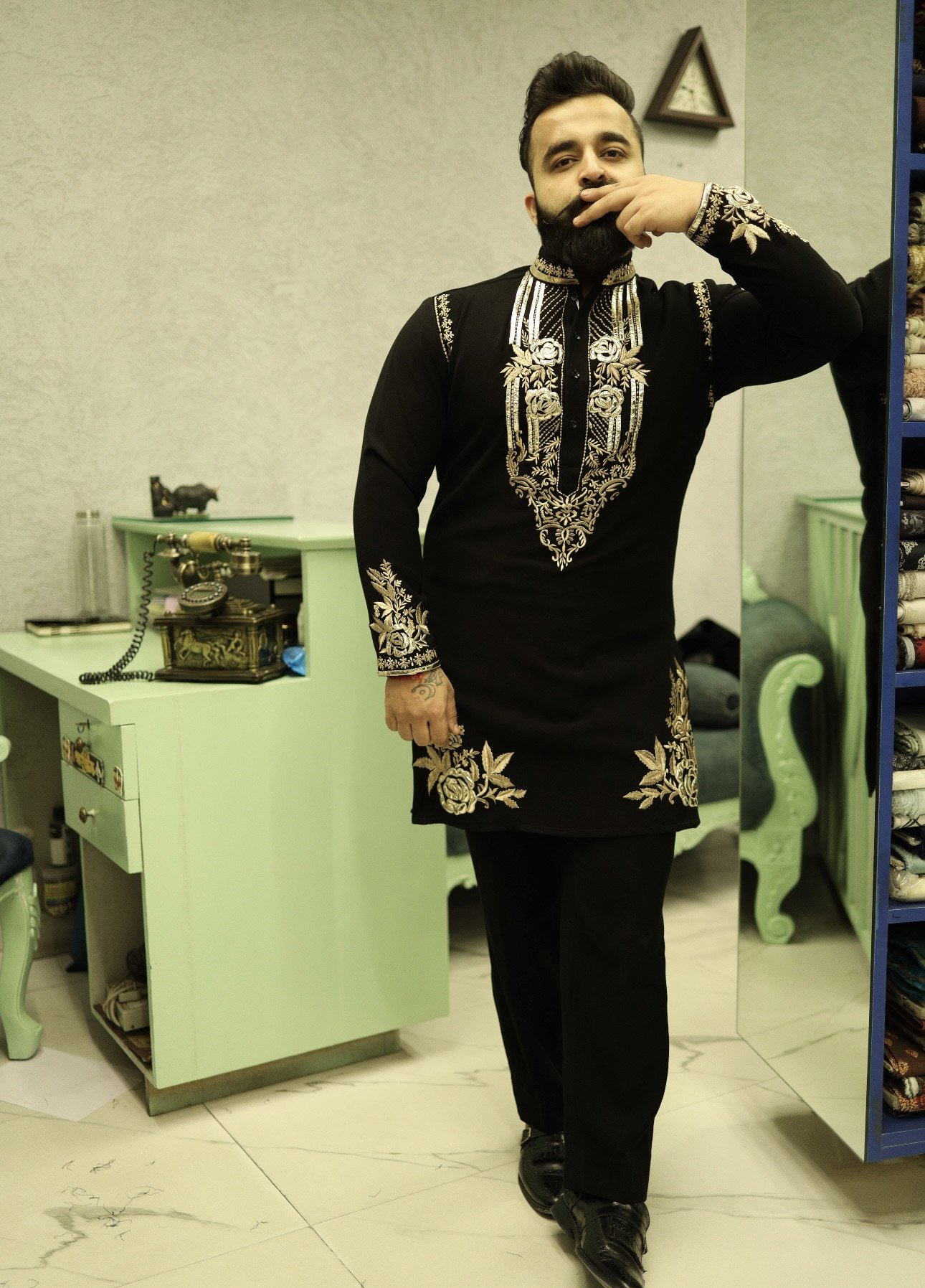 Crafted from premium Italian fabric, the kurta offers a rich texture, fluid drape, and superior comfort. The deep black base provides a striking backdrop for the gold leather embroidered detailing, meticulously handcrafted to create depth, contrast, and a luxurious finish. Each embroidered element reflects skilled artistry, precision, and attention to detail, making this ensemble truly stand out.