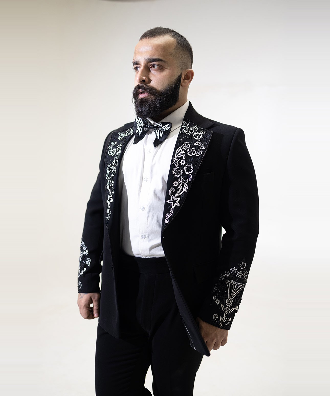 The Black Premium Fabric – Ivory & Black Embroidered Tuxedo Set is where sophistication meets perfection.