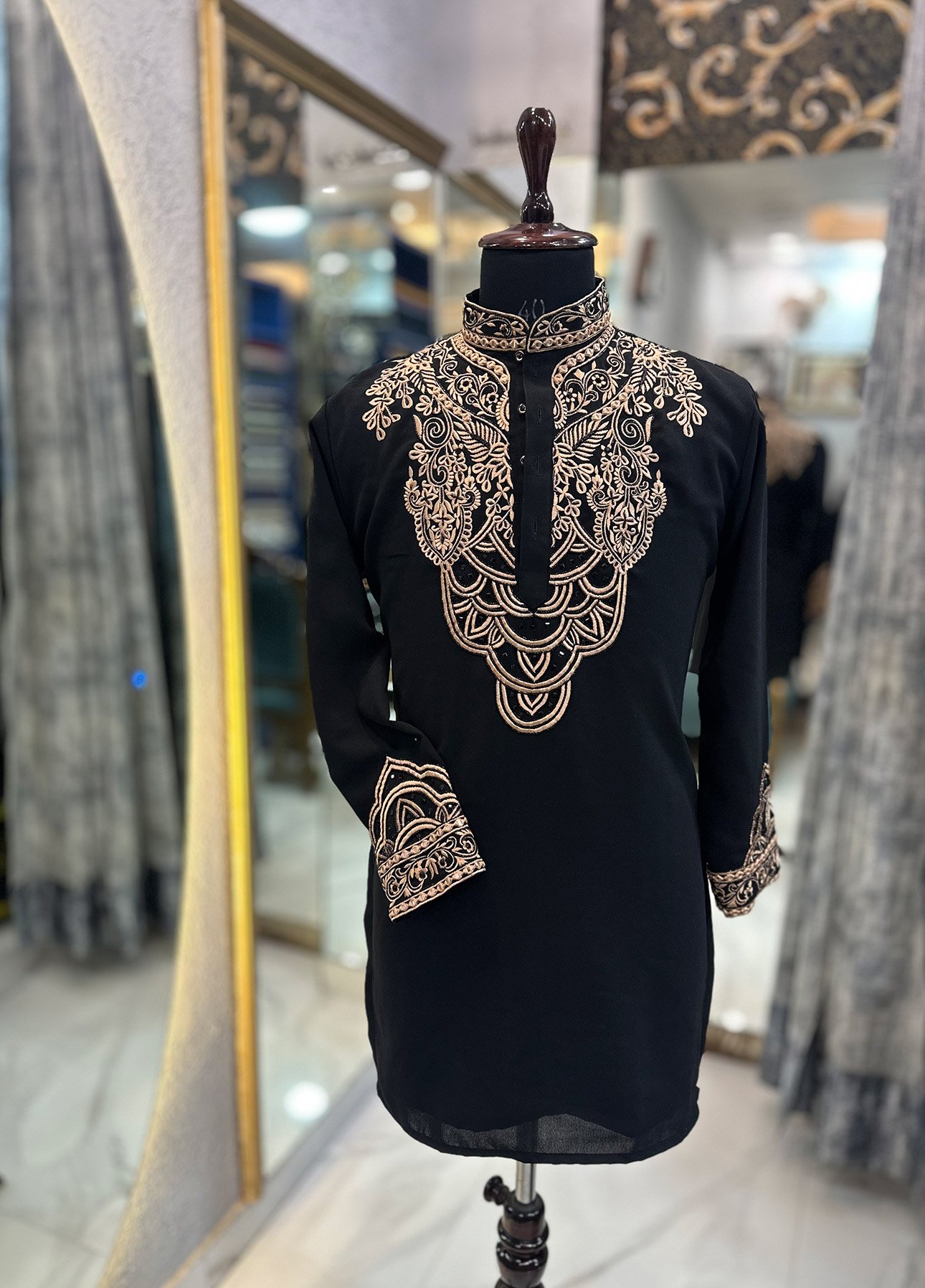 Crafted from premium-quality fabric, the deep black base creates a powerful and timeless canvas. The kurta is adorned with intricate rose gold embroidery, adding a subtle yet striking contrast that exudes richness and refinement. Each embroidered detail is meticulously handcrafted by skilled artisans, ensuring precision, durability, and a flawless finish.