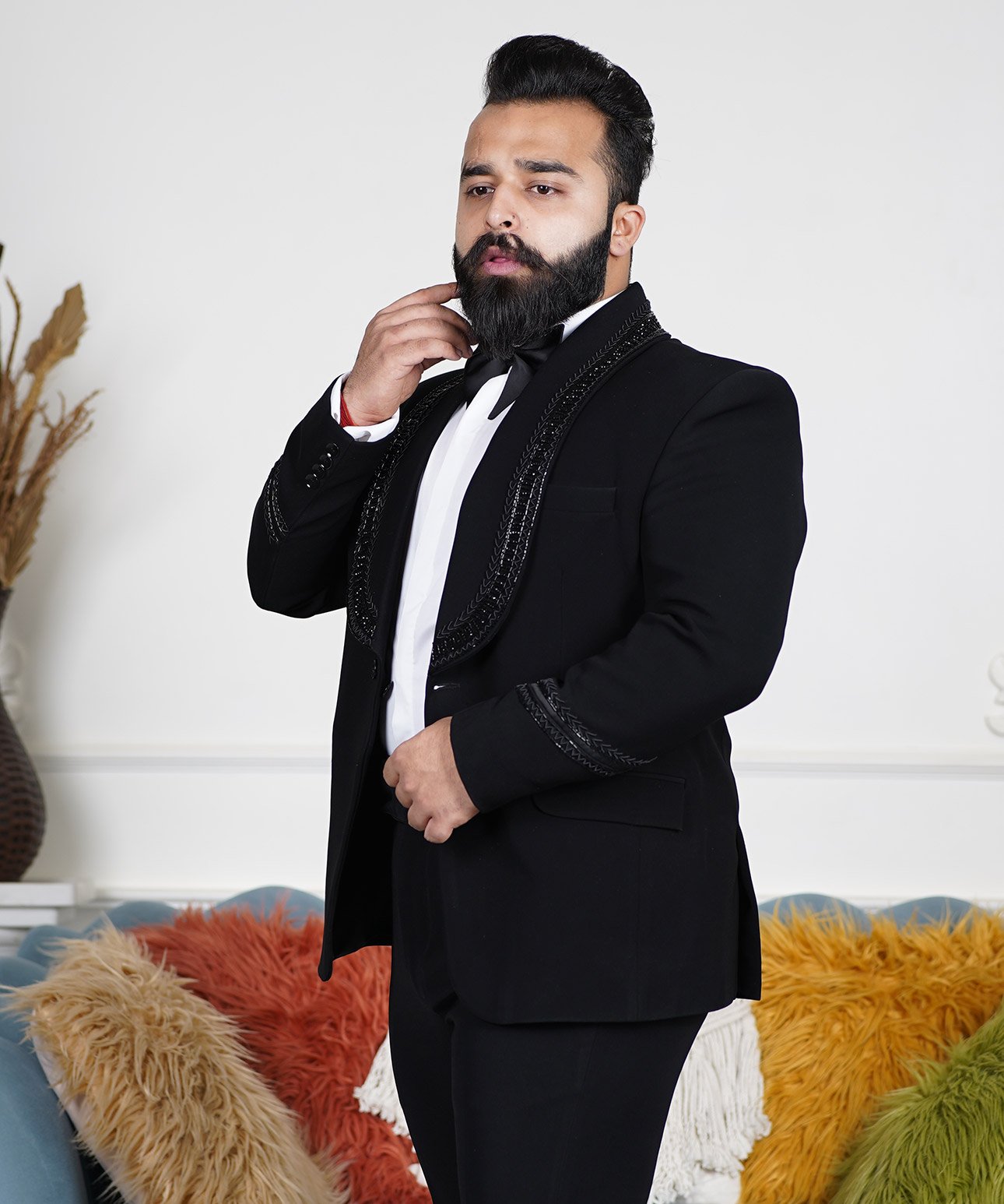 Made from premium-quality black fabric, the tuxedo offers a structured yet comfortable fit that defines elegance. The embroidered detailing across the jacket enhances its luxurious appeal, while the shawl collar adds a touch of classic refinement. The look is completed with a matching bow tie, giving it a perfectly balanced formal finish ideal for high-profile events.