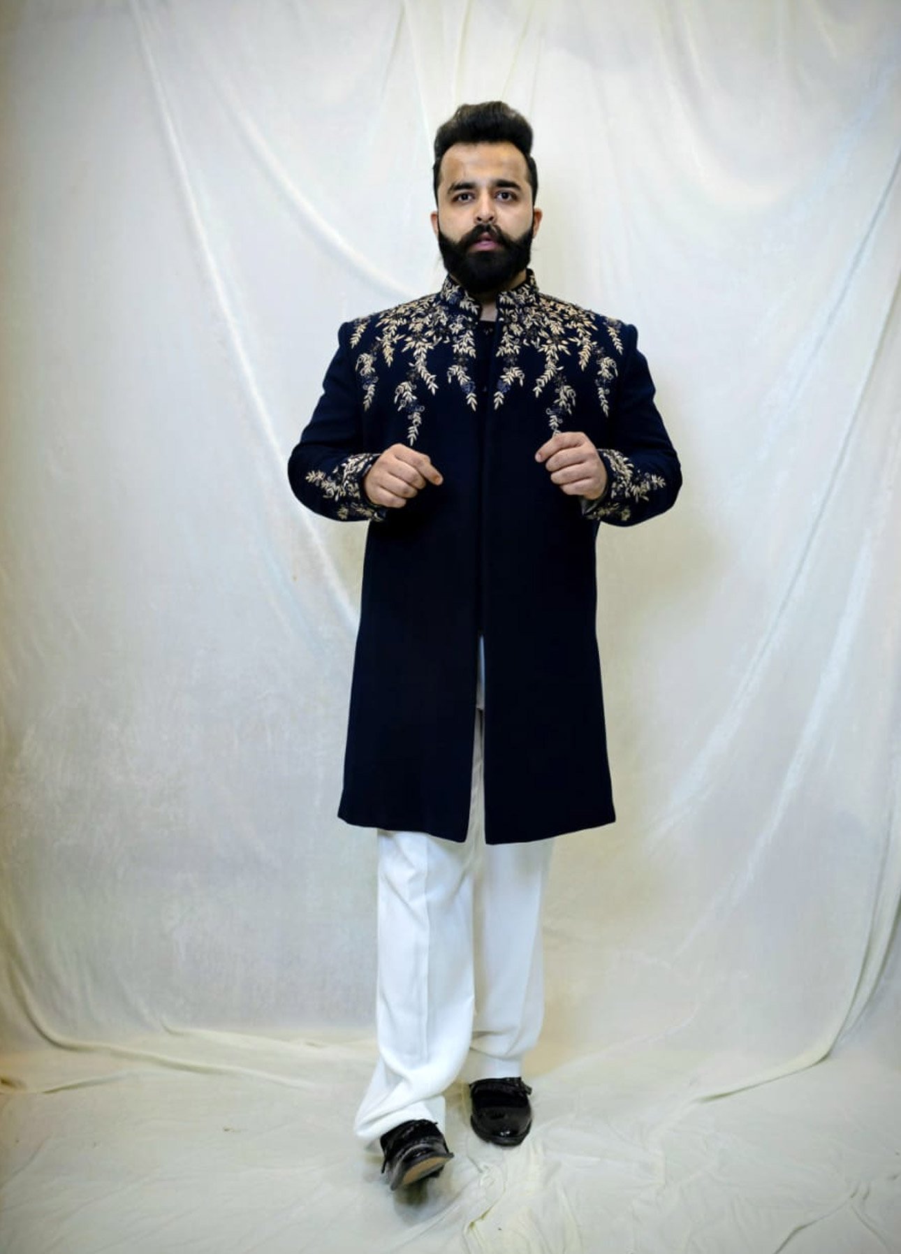 Made from premium-quality fabric, the deep dark blue base provides a rich and commanding presence. The outfit is adorned with intricate gold and black embroidery, creating a striking contrast that adds depth, elegance, and refined artistry. Each embroidered motif is meticulously handcrafted by skilled artisans, reflecting precision, heritage-inspired detailing, and luxurious craftsmanship.