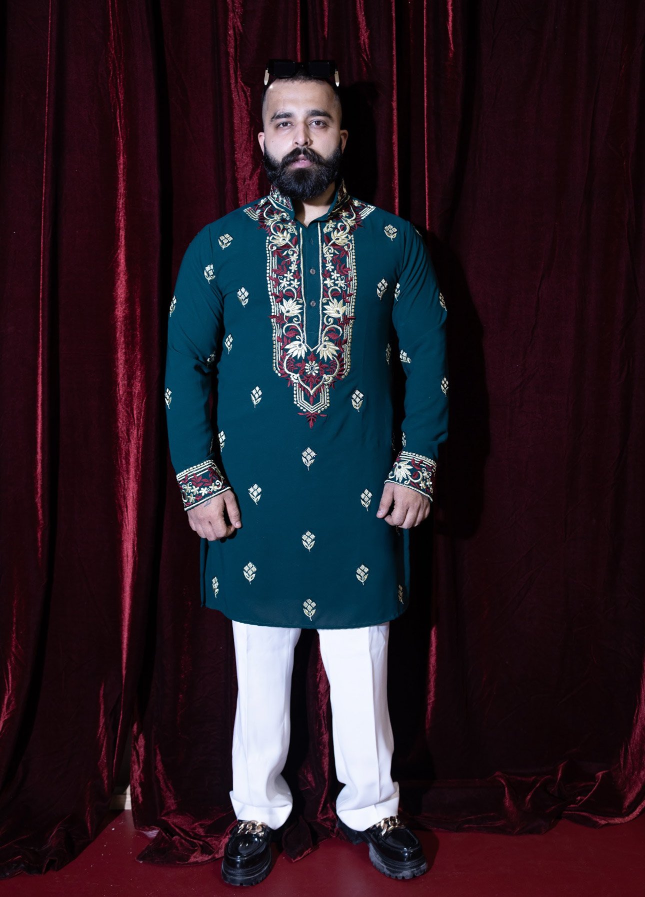 Embrace timeless grandeur with the Green with Gold & Maroon Embroidered Kurta Set from The Nawabs Clothing. Designed for the modern man who values tradition, craftsmanship, and refined luxury, this kurta set radiates elegance and royal charm.