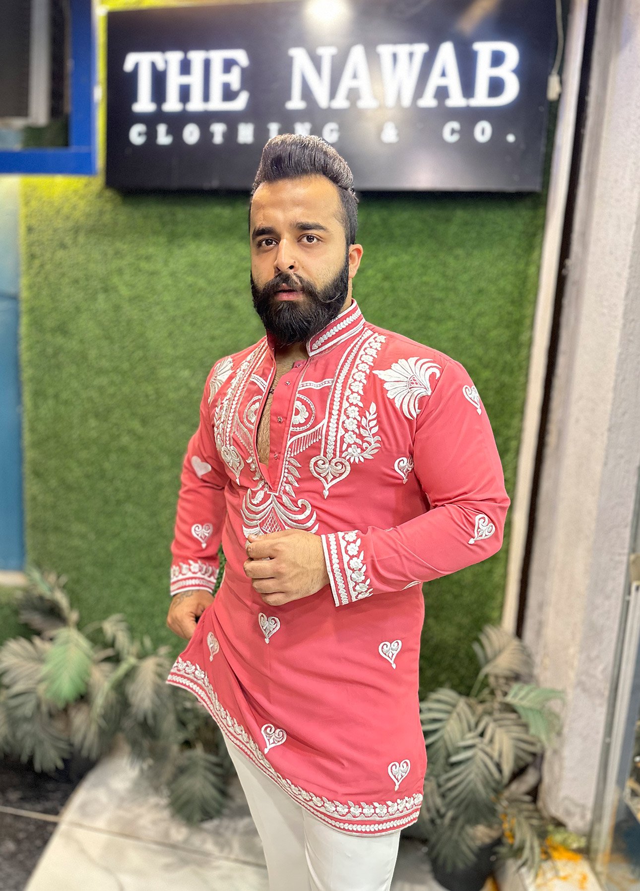 Elevate your ethnic wardrobe with this distinctive short kurta. crafted from soft breathable crepe this features and eye catching salmon pink hue. the garment is richley adorn with white embroidery details feature in elegant floral and swelling patterns across the yoke blacket and hen adding a touch of regality the traditional Mandarin collar is subtle updated with an open neckline providing a modern comfortable fit style hair with crist white bottoms this piece is ideal for festival occasions Pre wedding functions or smart casual gatherings step out IN confidence in classic flair